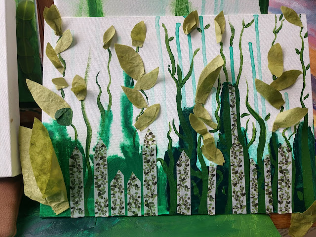 "Foliage" fine art will soon be complete. I have been using a flowered masking tape to add interest and designs to the piece. The handmade paper leaves also lend a nice touch. The scrapboard is made with acrylic paints. I have been fortunate to have time to go to my art studio twice per week, and I really have enjoyed working on my plant scrapboards. There are two more in the series that I will be posting pictures of. Enjoy.